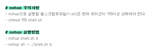 리눅스에서 사용되는 nohup 명령어는 두 가지 기능이 있습니다. 1. 표준 출력을 nohup.out (또는 다른 곳) 으로 돌리는 작업을 수행 2. 프로세스가 중단되지 않는 백그라운드 작업을 수행 # nohup 사용하