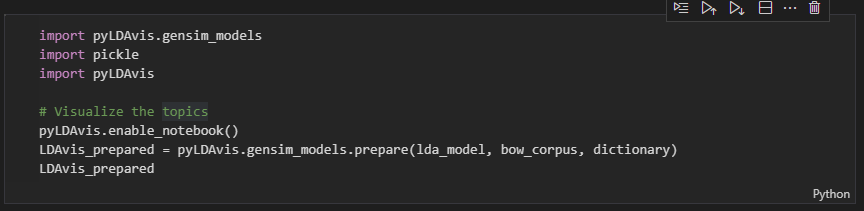 (lda_model, bow_corpus, dictionary) : lda 모델로 진행하고, Bag of Words 를 이용하여 단어의 등장빈도를 알고, 딕셔너리 형태로 지정해준다.