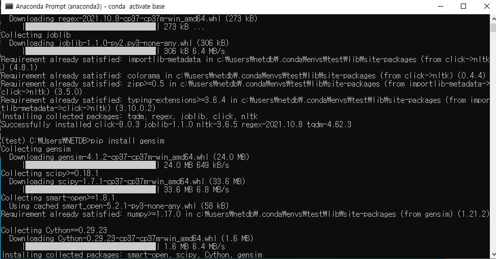 (혹은 cmd - conda install gensim) !!