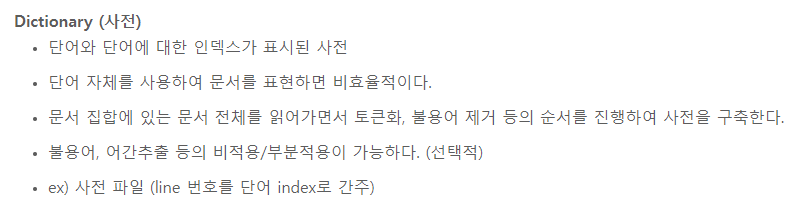 단어 자체를 사용하여 문서를 표현하면 비효율적이니까 문서 집합에 있는 문서 전체를 읽어가면서 토큰화, 불용어 제거 등의 순서를 진행하여 사전을 구축한다
