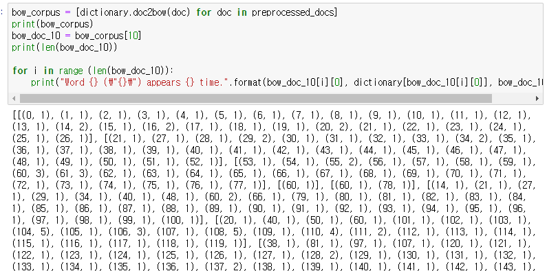 dictionary 형태로 만들어주는 것에서 (unique word, frequency) 형태로 만들어주는 과정을 거친다